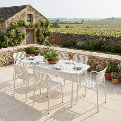 Crafted from durable, powder coated aluminium, the Week End Garden Furniture Sets are designed for outdoor use throughout the seasons. The lightweight construction makes pieces easy to move, while the structured frames and repeating lines give the collection its recognisable character.