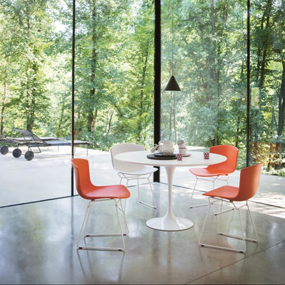 When selecting dining room chairs, consider scale first. A comfortable fit between seat height and table top is essential, as is proportion to the size of the room. For those who like to change layouts or frequently entertain guests, stackable dining chairs, like the Form & Refine Lunar Chair make it easy to adapt your space. If you prefer a more substantial presence and are not worried about saving space, choose something heavier like the Fritz Hansen Carimate Chair which has a grand feel.