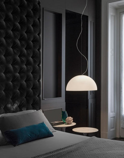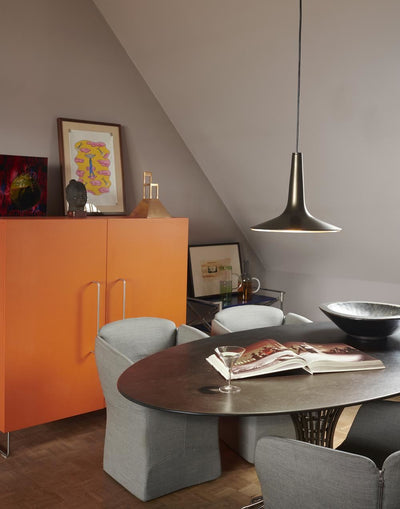 Atollo's secret probably lies in the geometrical construction of its shapes: the cone on the cylinder and the semisphere above all. It has a glamorous and splendid appearance. The shade has a spherical appearance directing light downward onto the table surface, making a pleasant indirect enviroment.